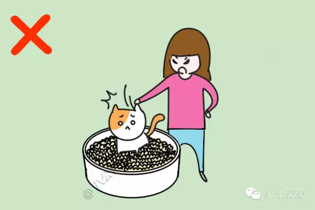 不要在排便时打骂猫咪 猫咪都是敏感的,在排便时打骂,猫咪可能会对猫砂盆产生恐惧而自行寻找其他排便的地方。