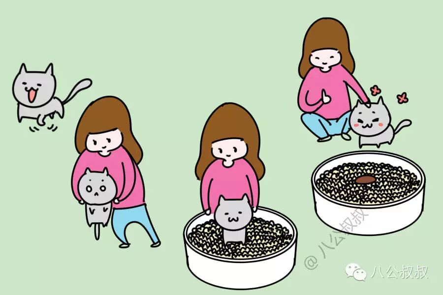 让猫咪明白便盆和猫砂 在离食盆、窝垫较远处安置一个外延较低的猫砂盆,铺以合适的猫砂。把幼猫抱入猫砂盆,让猫咪感受猫砂的质地、气味;用手翻动猫砂给它看,让猫咪明白这里可以掩埋他、排泄物。