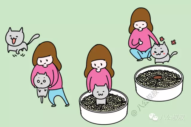 在适当时间训练猫咪排便 一般在猫咪睡醒和进食后或有如厕动作时,主动把猫抱到猫砂盆内让其排便。成功了可以抚摸猫咪作为鼓励。多重复几次即可养成定点排便的习惯。排便时不要一直盯着猫咪使其产生紧张感,无视可以让猫咪安心排便。
