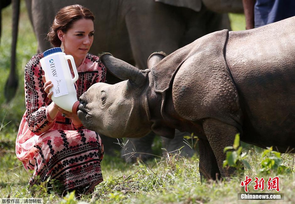当地时间2016年4月13日,印度阿萨姆邦,威廉夫妇访问野生动物康复和保护中心,手持奶瓶喂食动物。